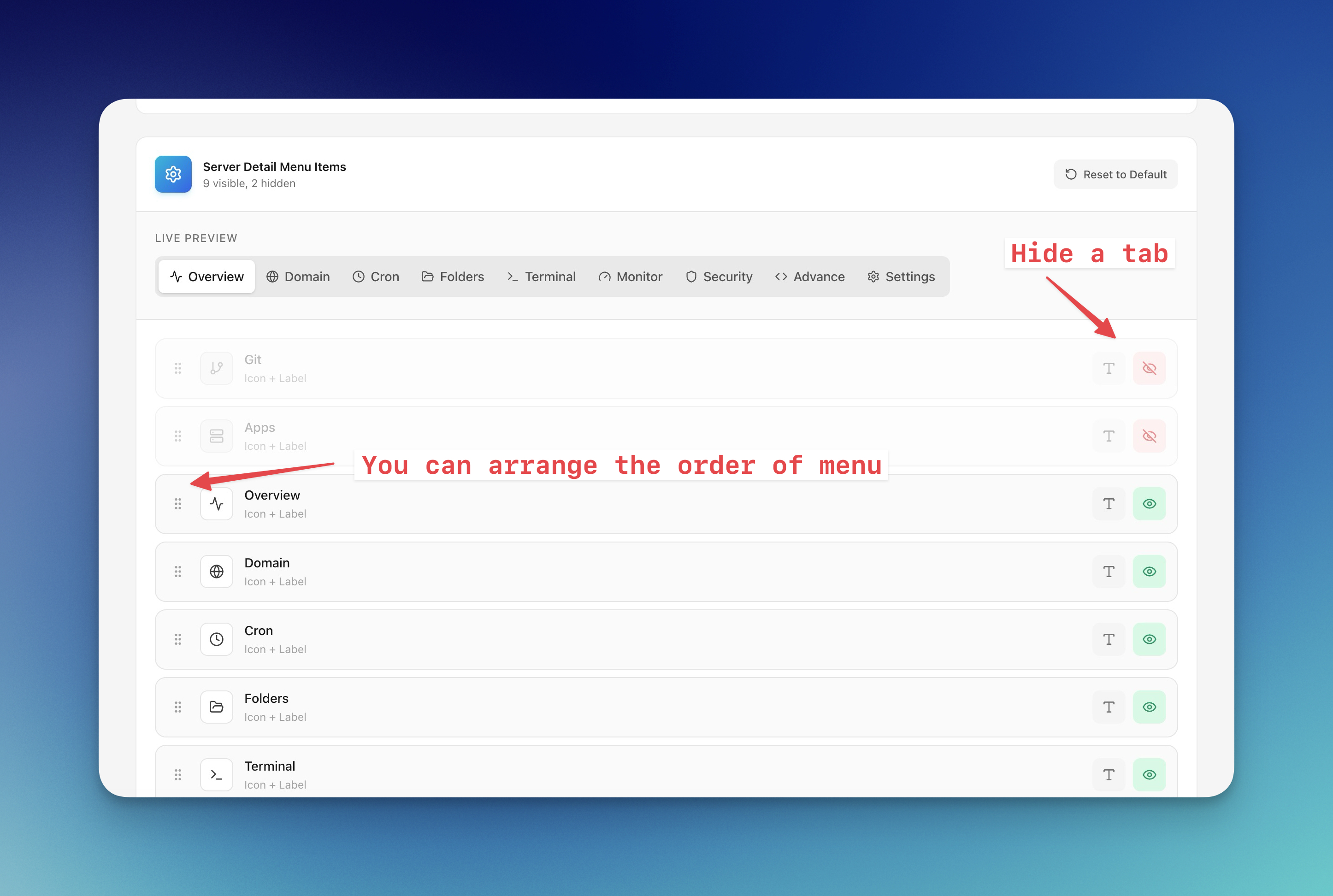 Personalize your navigation by reordering tabs, hiding unused features, and switching to icon-only mode for a compact view. Drag-and-drop with live preview and instant save.